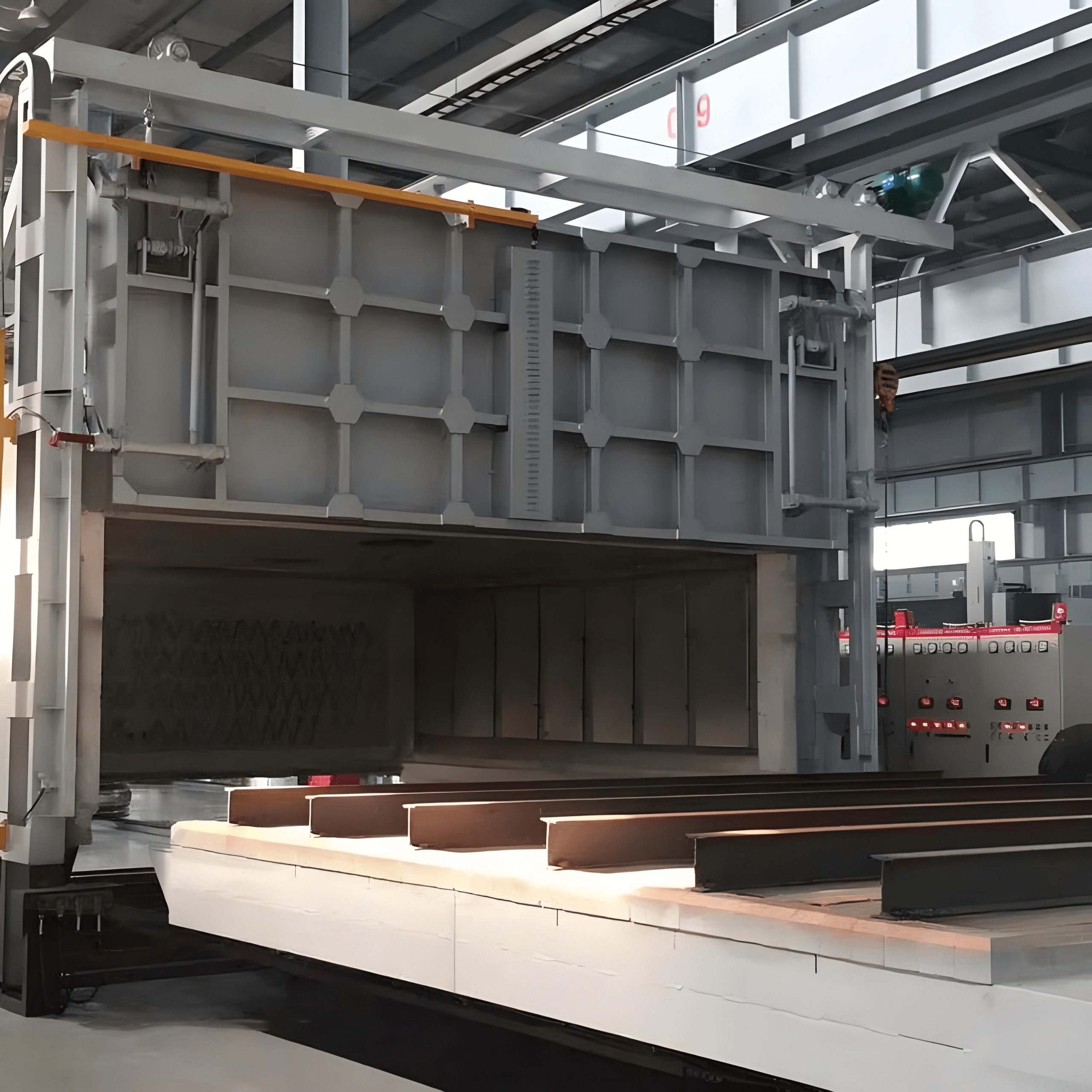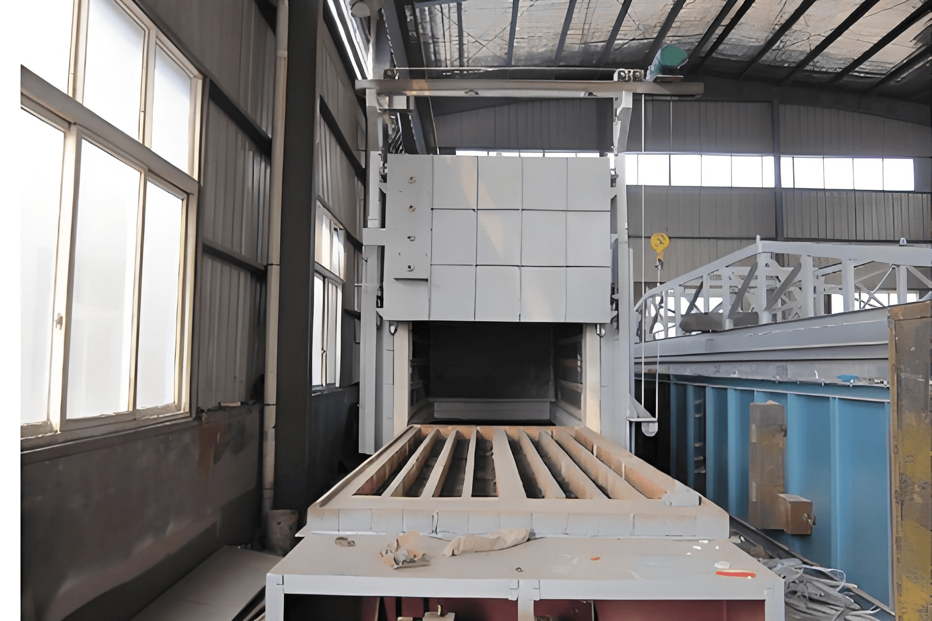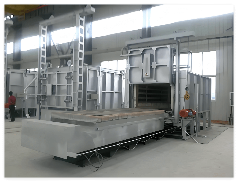 The built-in rail-guided trolley allows easy loading and unloading of large components such as steel castings, rolls, balls, hammer heads, and pressure vessel segments. The trolley can be operated by motor or reducer system, and features robust construction to support loads of up to 3–12 tons.