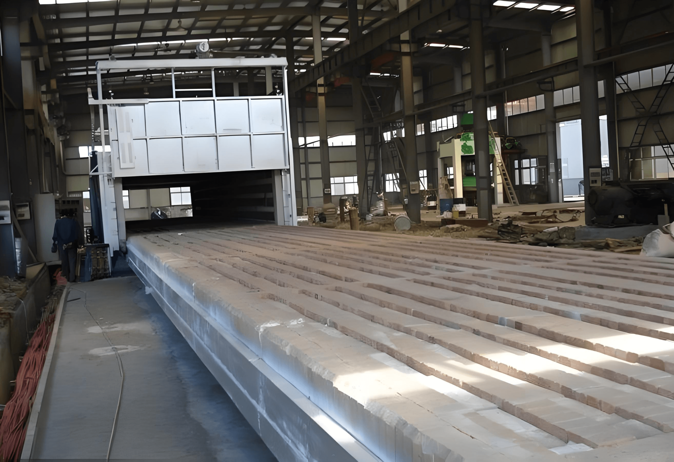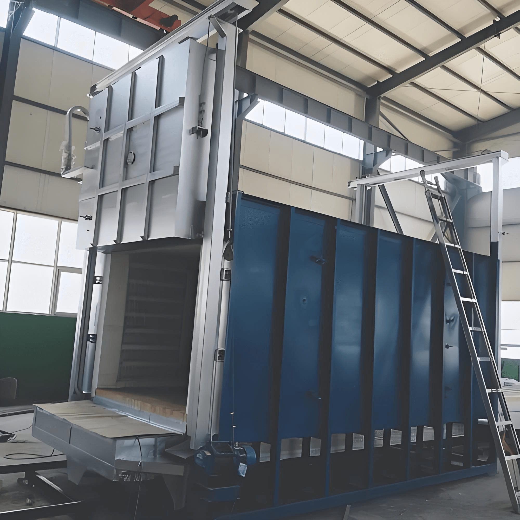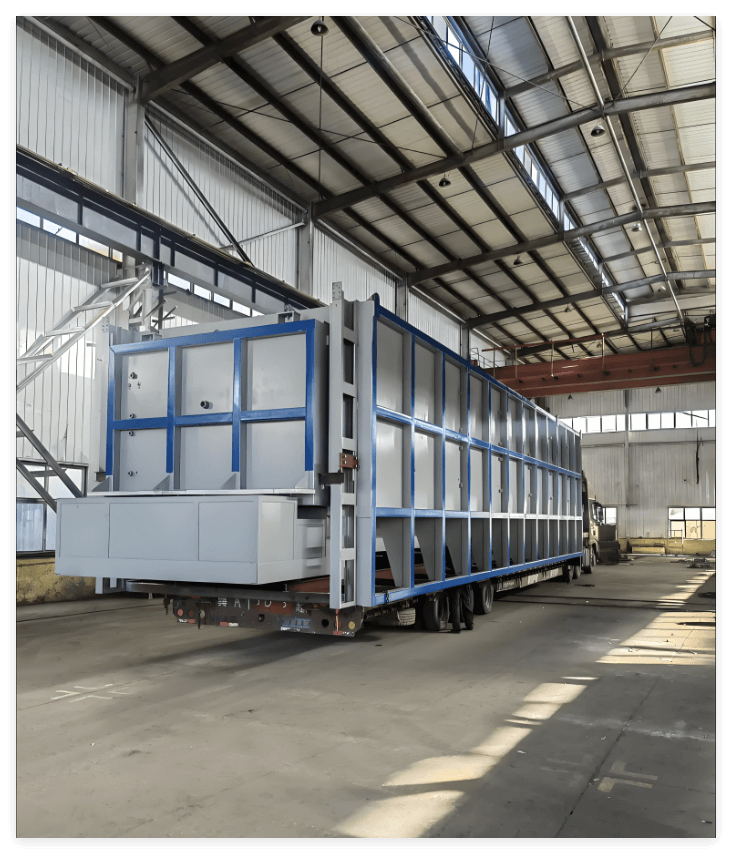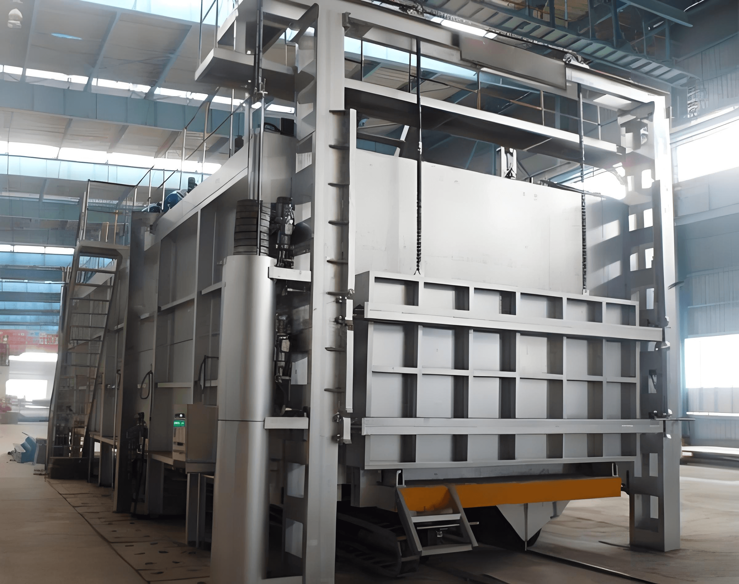 The built-in rail-guided trolley allows easy loading and unloading of large components such as steel castings, rolls, balls, hammer heads, and pressure vessel segments. The trolley can be operated by motor or reducer system, and features robust construction to support loads of up to 3–12 tons.